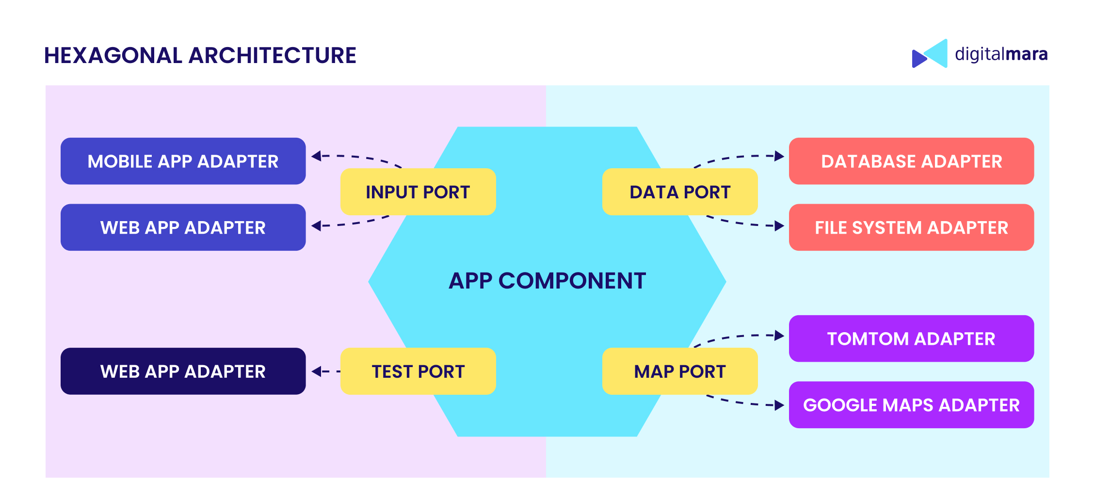 - Secondary (driven) adapters: Located on the right, these respond to events. They implement the ports and wrap external services like databases, APIs, or file systems.